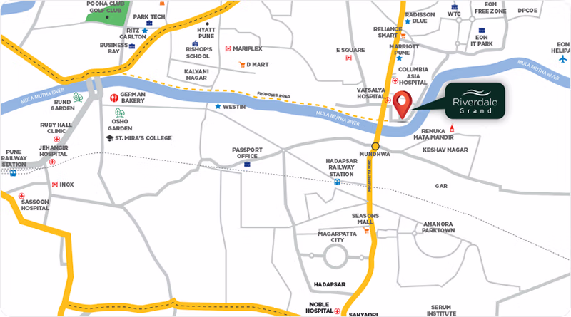 Multiple Entry & Exit points from the Riverdale Riverfront Road to the Kharadi-Mundhwa Bypass, to Magarpatta, to Nagar Road, to the airport etc